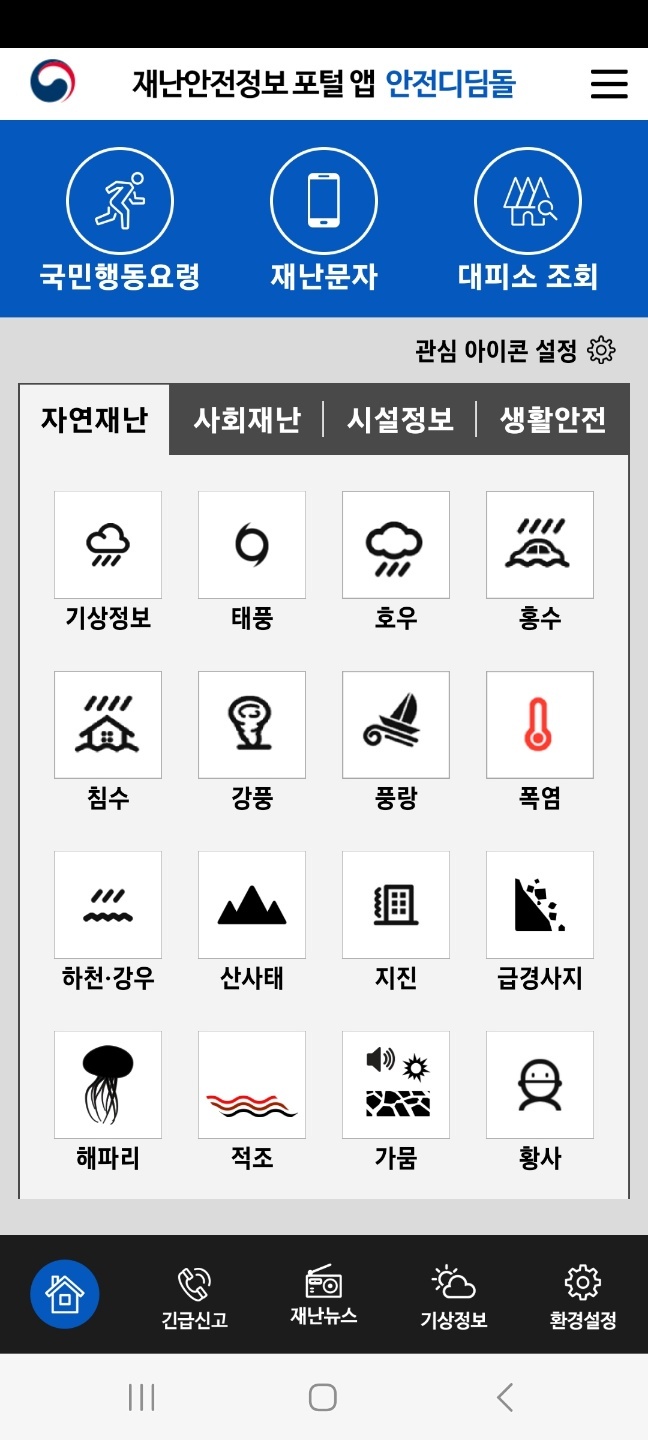 ‘안전디딤돌’은 정부대표 재난안전 포털앱으로 재난발생시 또는 일상생활에서 필요한 다양한 재난안전 정보를 제공하고 있습니다. 긴급재난문자, 재난뉴스 및 재난신고, 민방위대피소, 병