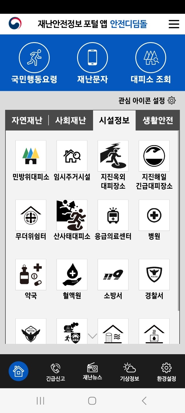 안전디딤돌앱은 민방위대비소 외에 각종 안전대비 정보를 확인할 수 있습니다.
