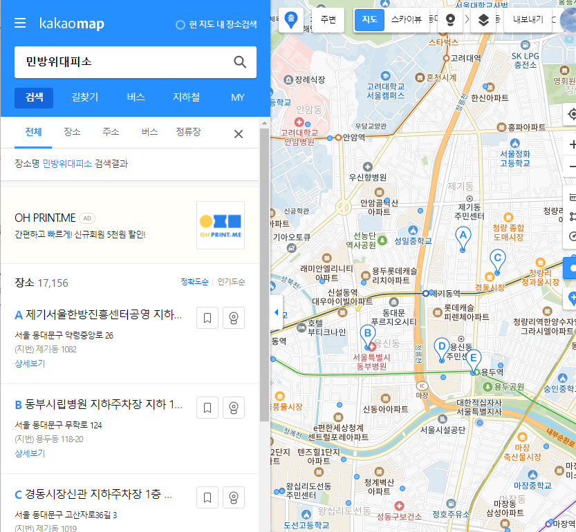 현재 위치에서 가까운 민방위대피소를 모두 지도에서 확인할 수 있습니다.