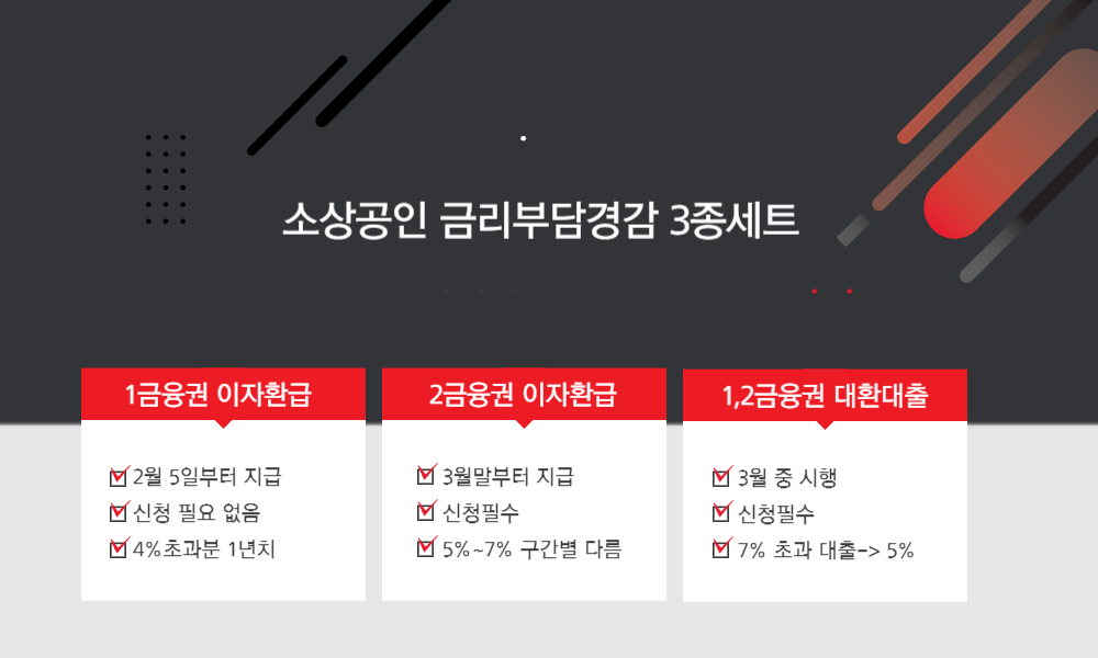소상공인 금리부담경감 3종세트가 2월 5일 부터 시행되었습니다.