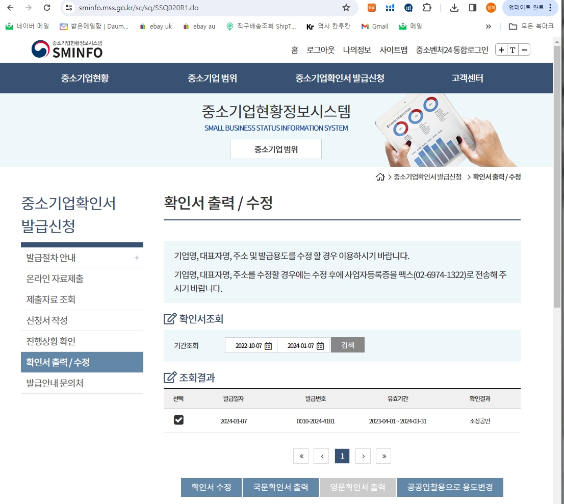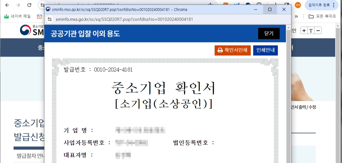확인서 신청 내역이 바로 확인되며, 출력할 수 있습니다.