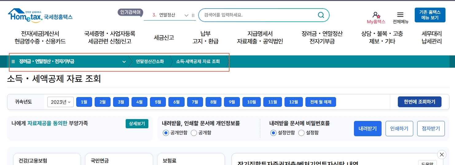 아래 이미지처럼 장려금연말정산전자기부금>연말정산간소화> 소득세액공제자료조회순으로 클릭하면 모두 조회가 가능합니다.