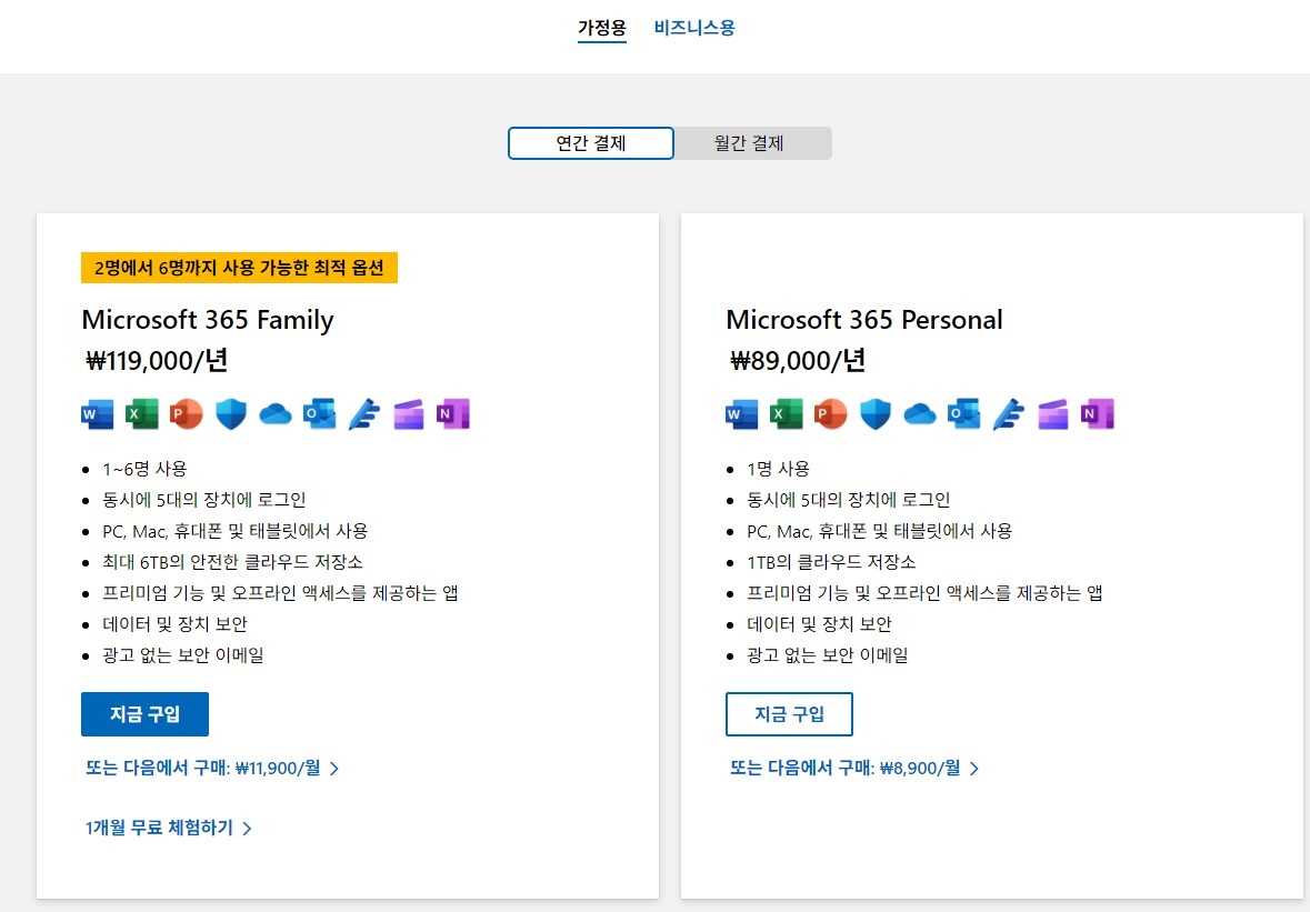 구독 유형은 가정용, 비즈니스용으로 나뉘며 가정용은 연간결제가 가능합니다.