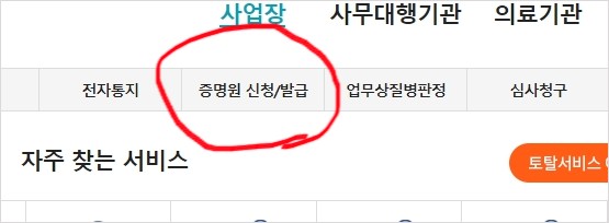 1. 상단에 메뉴를 이어 보면 '증명원신청/발급' 있습니다. 클릭하세요