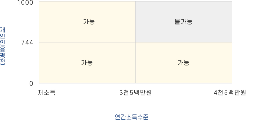 - 저신용자 : 연간 소득 4500만원 이하이고 개인신용평점이 744점 이하인 경우