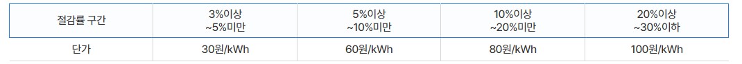 절감율에 따라, 절감량 1kWhe당 30원에서 100원까지 캐시백이 됩니다.많이 줄이면 더 많이 캐시백을 받습니다.
