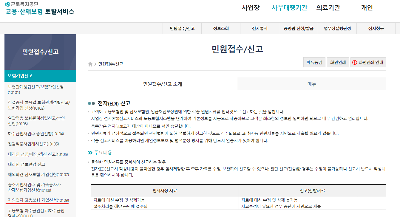 2. 민원접수/신고 -> 자영업자 고용보험 가입신청을 누릅니다.