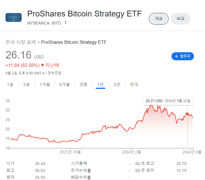 비트코인의 가격변동이 무서워서 섣불리 접근은 못하겠는데 관심을 끊을 수 없는 상황이라면 BITO ETF를 담아보는 것도 방법이 될 것입니다.