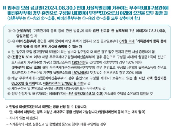 1) 주민등록상 서울특별시에 거주하는 성년자인 무주택세대구성원(예비 신혼부부의 경우 무주택자)으로서,